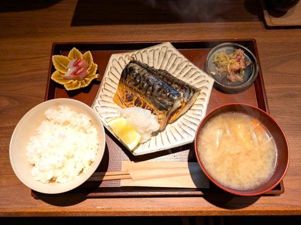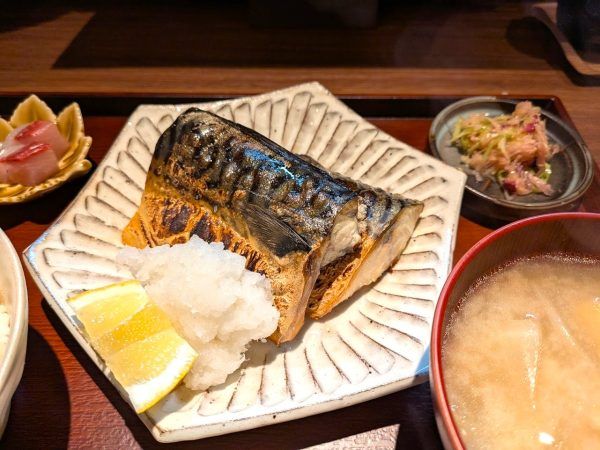 焼きサバ定食 950円 大きい半身を2枚に切った焼きサバに、お造り・小鉢・お味噌汁・ご飯付きです。ご飯とお味噌汁はおかわり出来ます。