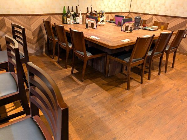 新しい~。気持ちいいですね。縦に長い店内で、入口側にテーブル席、中間に大きな正方形のテーブル席、奥にカウンター席があります。