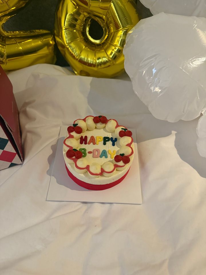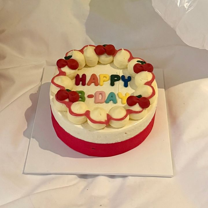 赤と白の二層のベースに、カラフルなHAPPY BIRTHDAYの文字、そして丸々としたクリームやさくらんぼをモチーフにしたデコレーション……可愛すぎる!!!😭🩷