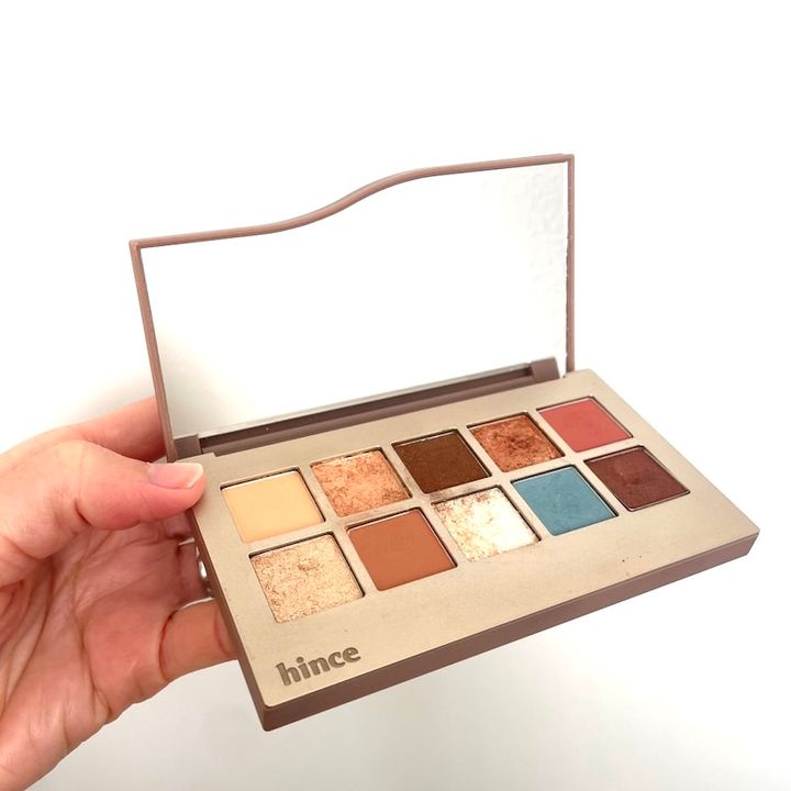 華やかで印象的な目元にしたいときは、濃い色を足すのではなく、パールやラメなど程よいツヤ感のある淡色のアイシャドウを目頭にのせるのがおすすめ。目頭を囲むように「くの字」に入れるのがポイントです。韓国コスメhinceのパレットは、色も質感も今っぽくて使いやすい。