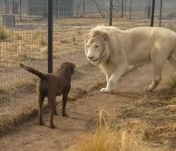 2. 危ない!!ホワイトライオンに睨まれた犬!しかしこの後、ライオンの紳士的な振舞いに驚愕!【海外】