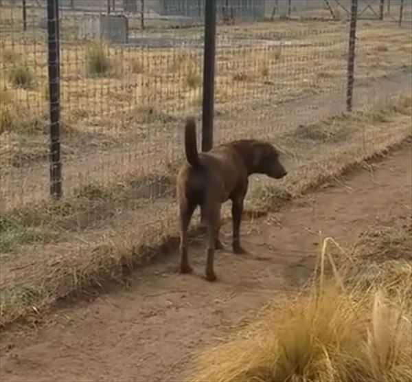 一匹のワンコ(名前:カミラ)にホワイトライオン(名前:ミキ)が接近してきます。迫力があります…。