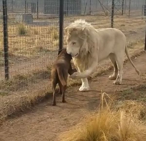 危ない!!ホワイトライオンに睨まれた犬!しかしこの後、ライオンの紳士的な振舞いに驚愕!【海外】