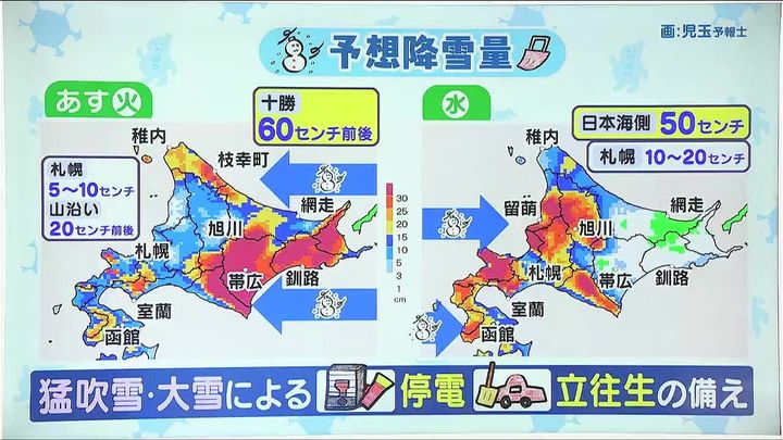 5日は西風に変わって、上川や留萌など日本海側の多いところで50センチです。猛吹雪や湿った大雪による停電や車の立往生に備えましょう。札幌の山沿いでも、4日・5日でそれぞれ20センチくらい降りそうです。