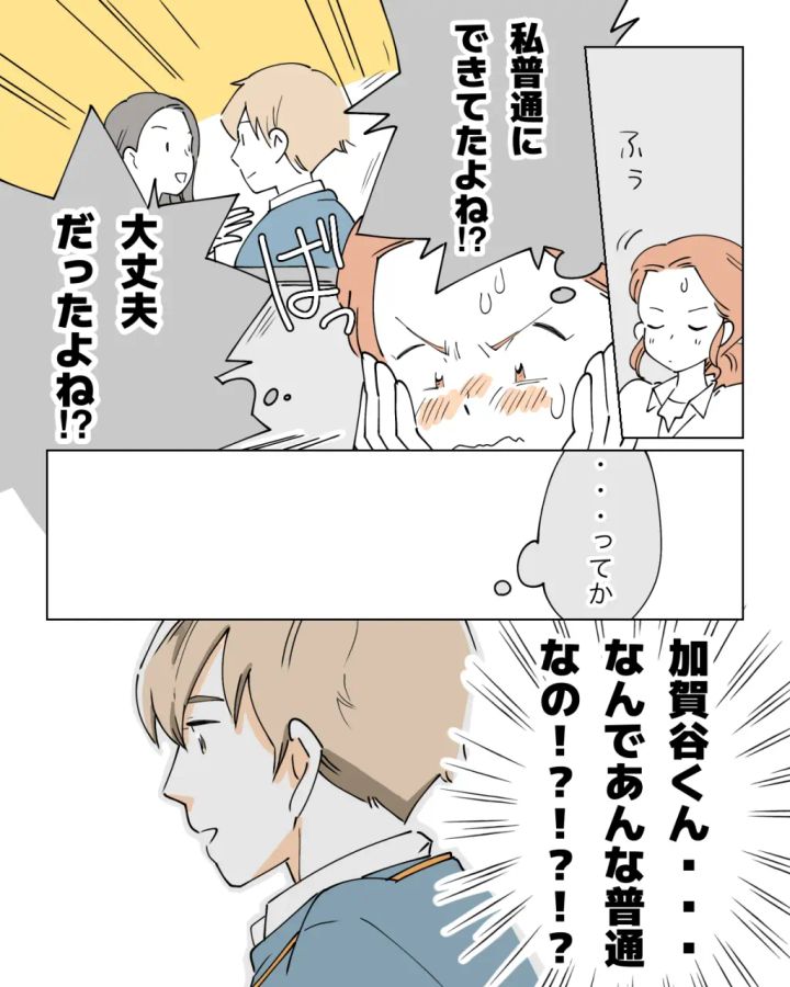 加賀谷くん達が席に戻った後、ふうっと一息吐いた私。私、普通にできてたよね!?大丈夫だったよね!?さっきは平静を装っていたけれど本当は心臓バクバクだった。・・・ってか、加賀谷くん・・・なんであんな普通なの!?!?!?