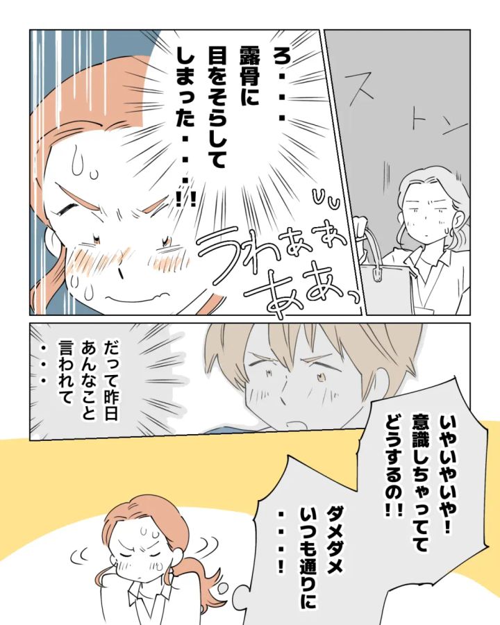 そのまま平静を装い自分の席に着いたけれど、頭の中は大パニック。ろ・・・露骨に目をそらしてしまった・・・!!だって昨日あんなこと言われて・・・。ふと昨日の告白がよみがえりまた動揺してしまう。いやいやいや!意識しちゃっててどうするの!!ダメダメいつも通りに・・・!私は気持ちを落ち着かせて仕事に集中しようとした。