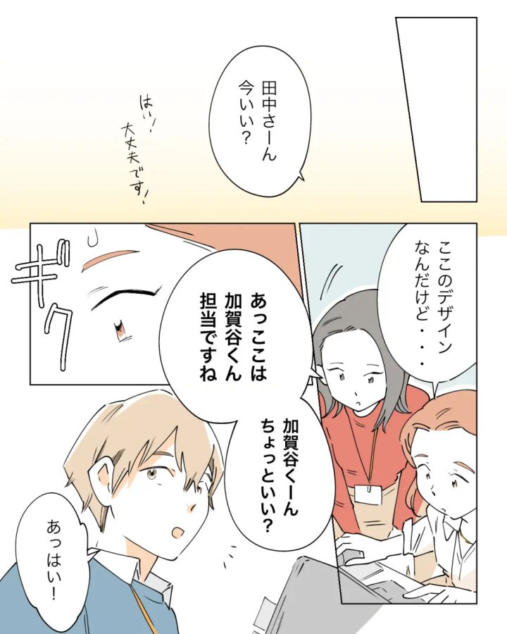 仕事が始まるといつも通り集中することができた。しかし、「田中さーん、今いい?」確認したい事があって田中さんを呼ぶと、「あっここは加賀谷くん担当ですね」と言われギクッ。田中さんが「加賀谷くーん、ちょっといい?」と加賀谷くんを呼びました。