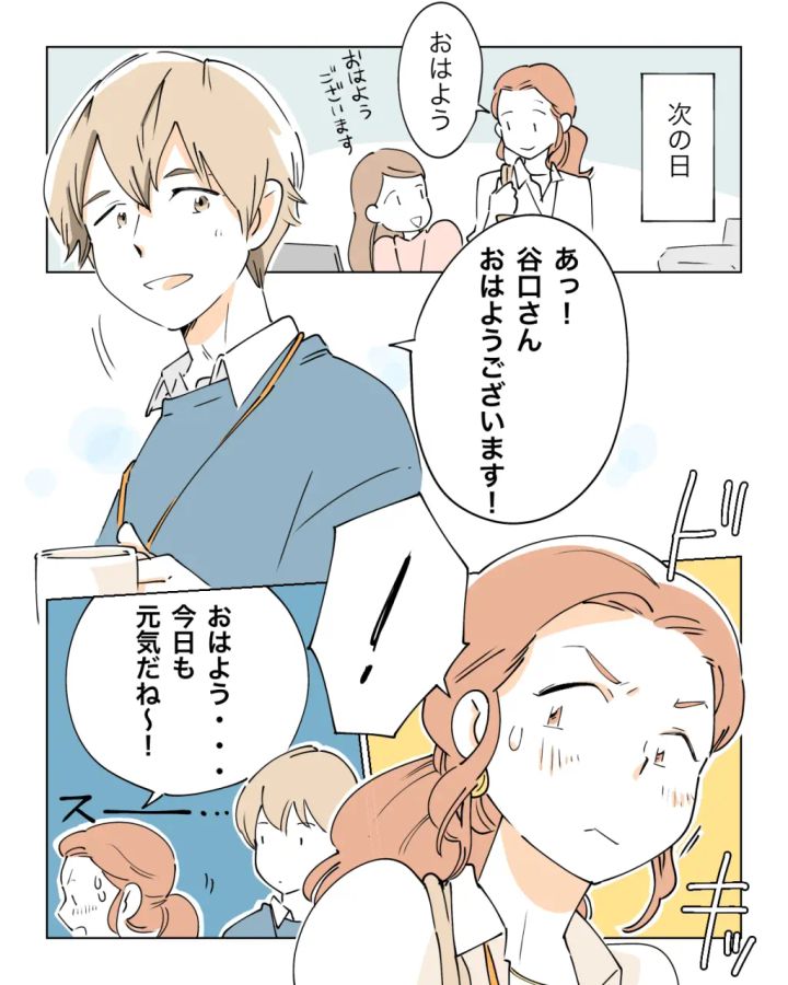 加賀谷くんに告白された次の日。出社すると「あっ!谷口さんおはようございます!」と加賀谷くんに挨拶され思わずドキッ!「おはよう・・・今日も元気だね~!」と返したものの、目を合わせられずそそくさと加賀谷くんの前を通り過ぎた。