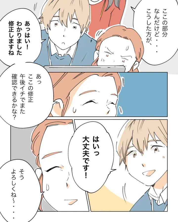 「ここの部分なんだけど・・・こうした方が」と田中さんに言われた加賀谷くんが「あっはい!わかりました。修正しますね」と言いながら私のパソコン画面をのぞき込む。私は加賀谷くんからそっと距離を取りながら「あっ、ここの修正午後イチでまた確認できるかな?」と平静を装って伝えた。「はいっ大丈夫です!」と笑顔で答える加賀谷くんに「そう、よろしくね~」と返すので精いっぱいだった。