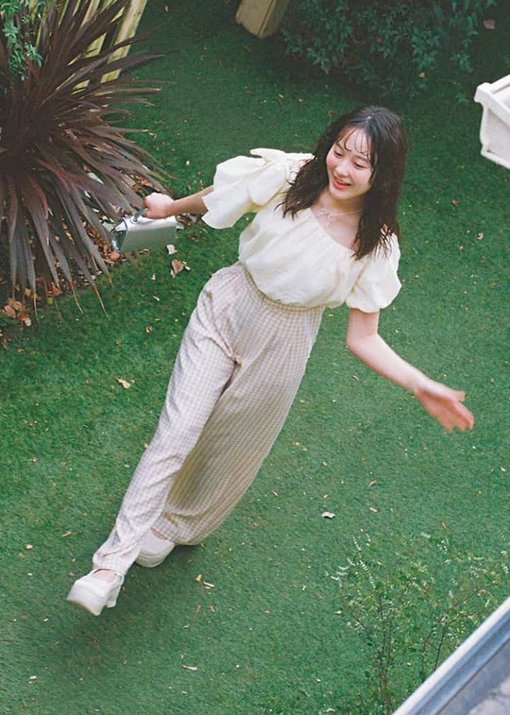 幼く見えがちなイエロー系のお洋服は、上品なシルエットを選ぶのが◎。パンツスタイルならより大人っぽい印象に仕上がる。