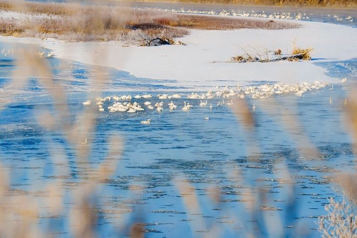 橋に近づくと、白鳥の鳴き声が遠くから聞こえてきます。白鳥が隊列を組んで空に飛んでいく光景も見ることができます。