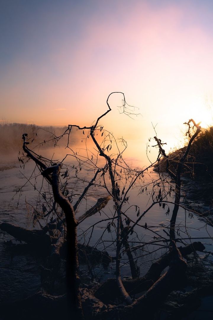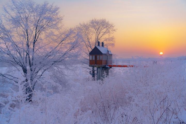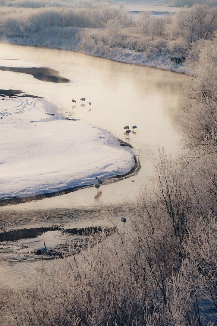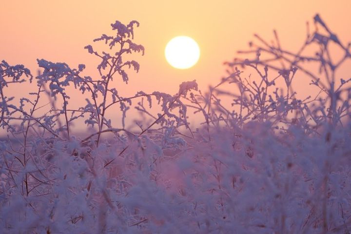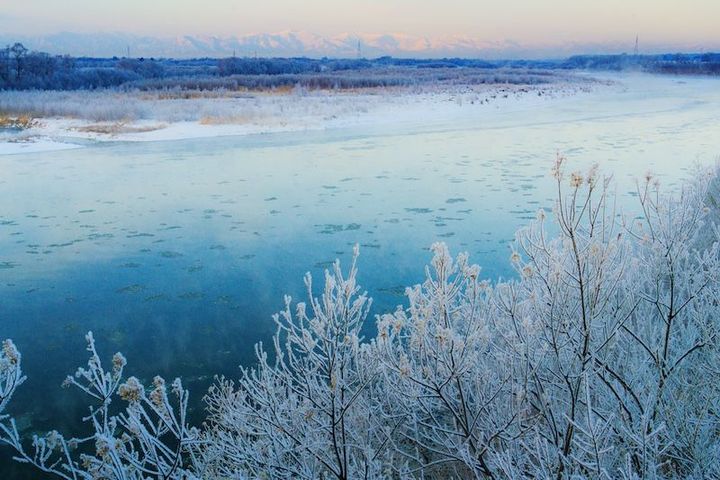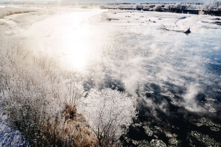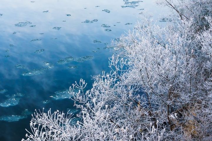 寒い早朝、川が近く空気中に水蒸気の量が多いせいか、あたり一面の景色はすべてが凍っています。