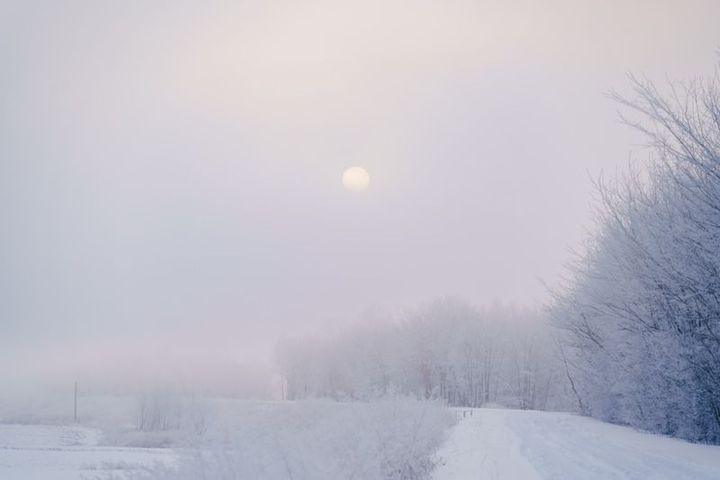 凍てつく霞の中から、うっすら浮き上がる太陽。