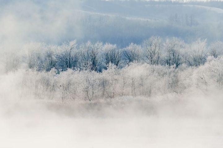 そのため川からは霧が湧き上がり、水蒸気でまわりの木々たちが凍てつき、樹氷になります。