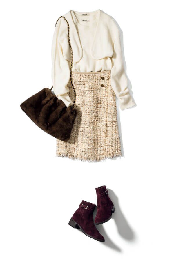 クラシカルなツイードは、洗練感を呼び込む白であか抜けさせて。