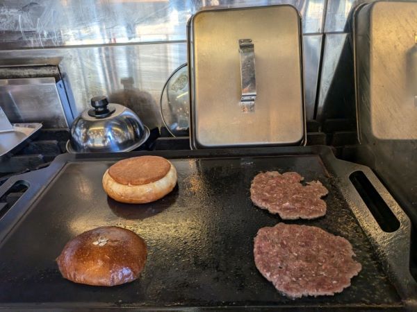 注文を受けてから作り始めます。パティを鉄板の上で押さえつけて焼き上げる「スマッシュ製法」でパティを焼いていきます。