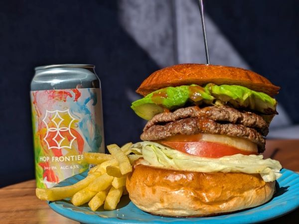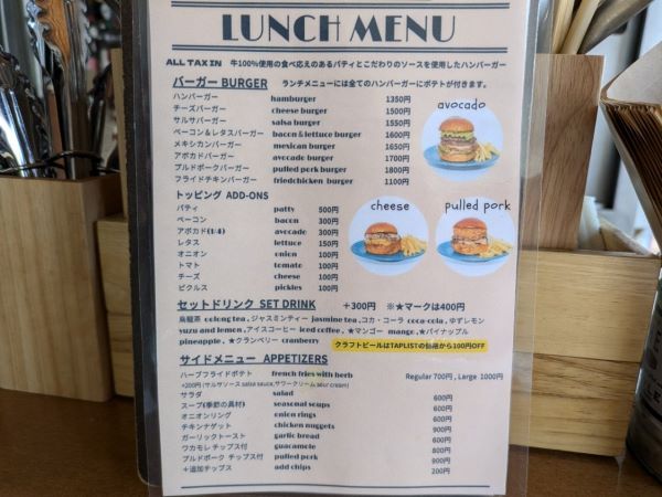 今回はこの中から店長さんお勧めの「アボカドバーガー」(1700円)と「HOP FRONTIER」(Juicy IPA)(レギュラーサイズ 900円)を試食させていただきました。 ランチタイム(11:30~15:00)には全てのハンバーガーにポテトが付きます。