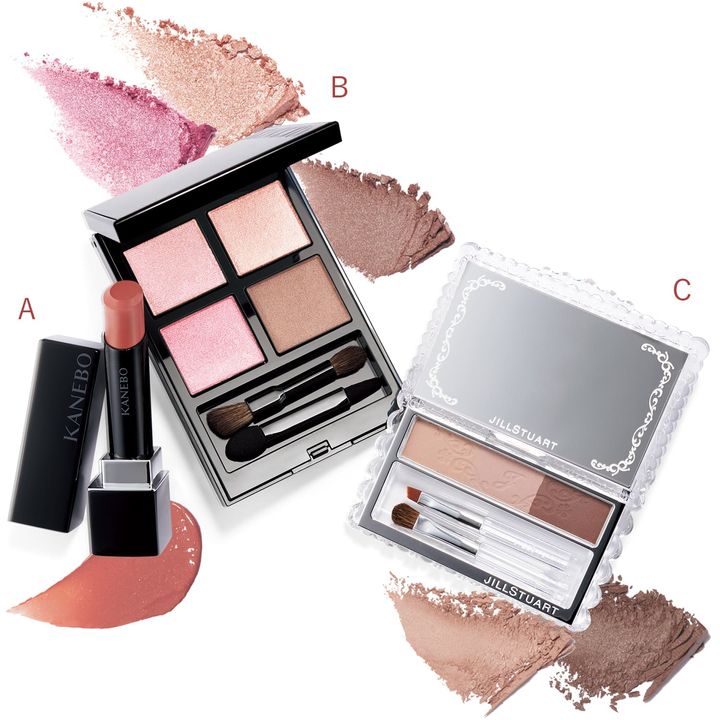Cの左2色で眉をふんわり描き、毛が足りない部分に茶色を。Bのゴールドでまぶたを整え、二重幅にピンクを。締め色はライン塗り。