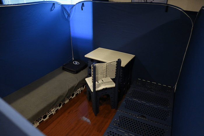 テントで仕切られる空間は縦横ともに2.45mで、折りたたみベッド2台と子どもが勉強できるような机と椅子を置くことができます。荷物を入れるキャビネットや毛布、蚊帳も作られるようになりました。