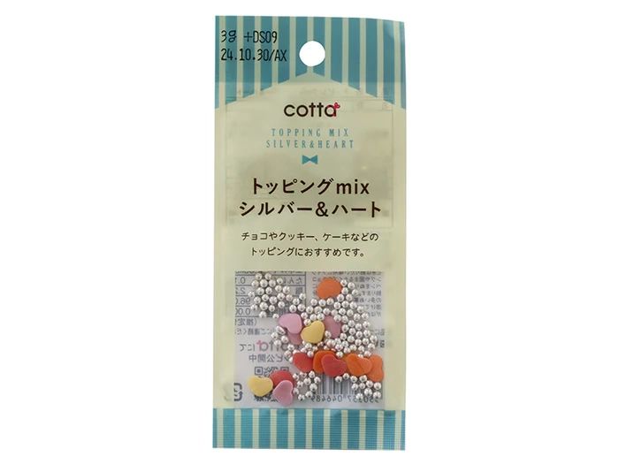 シルバーのアラザンとカラフルなハート型のシュガーがいっしょになったトッピングミックス。アラザンとシュガーがそれぞれちょっとずつほしい!という場合に便利ですね。