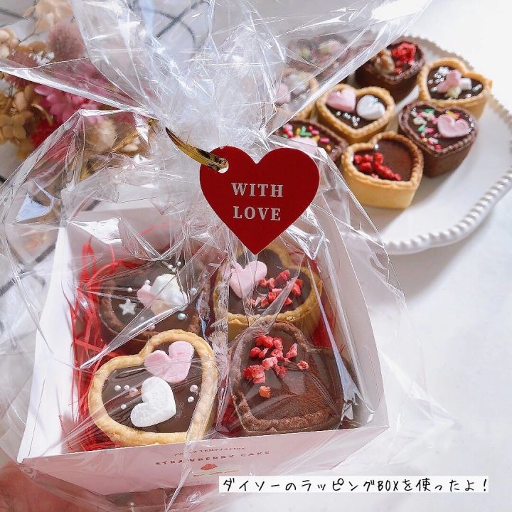 かわいいハートのミニタルトがよく見えて、思いが伝わるラッピングアイデアですね。