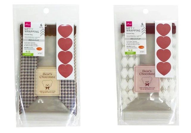 “ガゼット”とは、袋などのマチを意味します。食品を直接入れられるダイソーの「ガゼットバッグ」は、6cmのマチがあることで立体的に包装しやすく、厚みがあるものを入れるときや複数入れるときに便利です。ハートのシールも付属しているので、これだけでラッピングは完了!