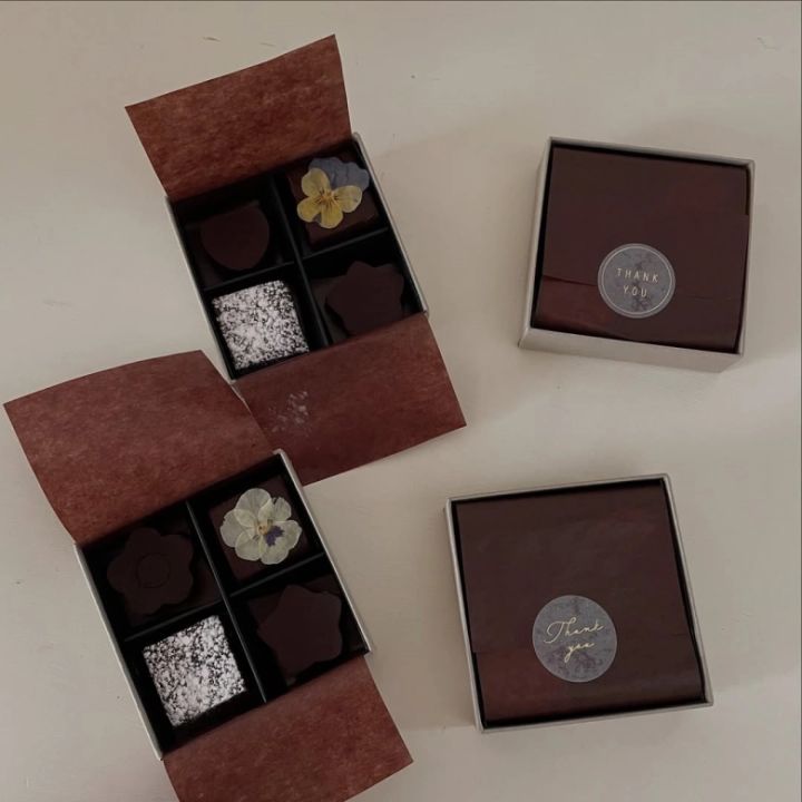 トリュフや生チョコをラッピングするのにぴったりな、仕切りつきのボックス。@piiiin_chouchouさんは、粉糖をかけたものやエディブルフラワーをのせたものなど、それぞれデザインの異なるチョコレートを詰め合わせています。