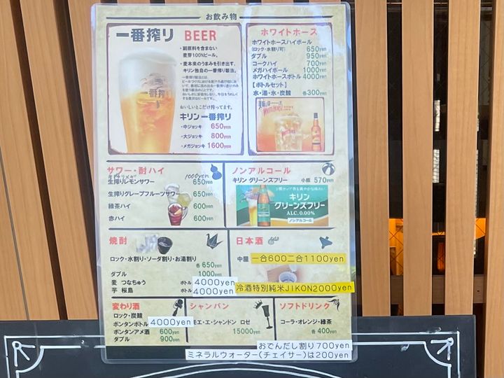 飲みもののメニューはこんな感じ。ビールをはじめ、お酒を楽しめます。 おでんを置いているので、「おでんだし割り」もありますね。