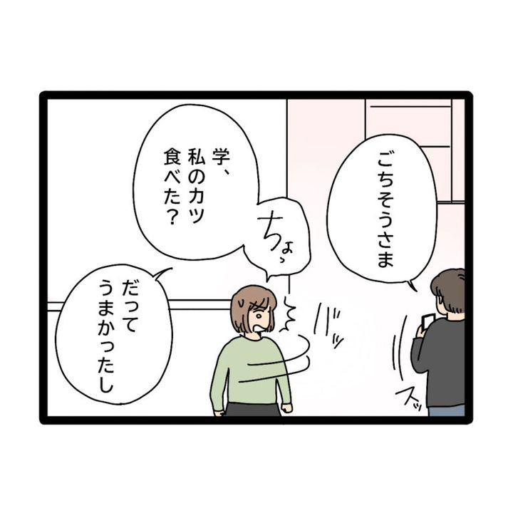 逃げるように「ごちそうさま」と席を立とうとする学さんに奈々子さんは「ちょっ学、私のカツ食べた?」と聞くと「だってうまかったし」と謝る様子も見せずに言いました。