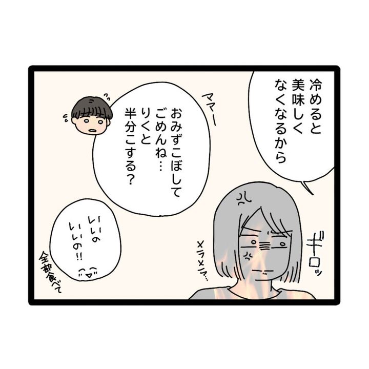 「ママーおみずこぼしてごめんね・・りくとはんぶんこする?」と申し訳なさそうに言うりくくんに「いいのいいの!!全部食べて」と笑顔で返事をしました。