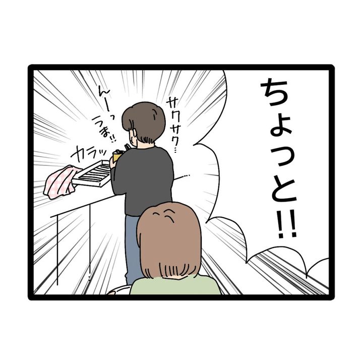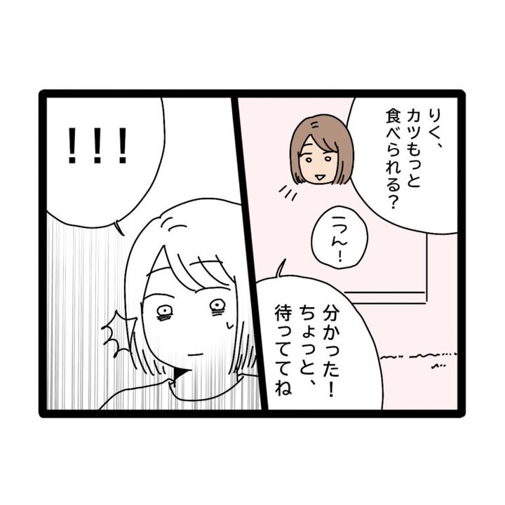 しばらくして奈々子さんがりくくんに「りく、カツもっと食べられる?」と聞くと元気よく「うん!」と返事があったので「分かった!ちょっと待っててね。」とりくくんのカツを取りに奈々子さんはキッチンに向かいました。