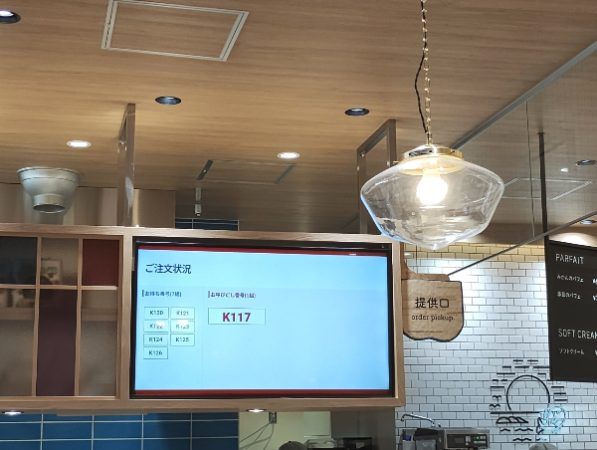 カウンターにあるモニターに、レシートに表記されている番号が表示されます。表示されたら提供口に取りに行くスタイルです。
