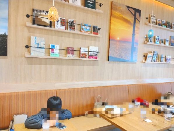 食券を購入した後、店内で待ちます。木材を基調とした優しいカラーの店内。壁際には本が並べられており、愛媛のきれいな景色の写真が飾られていました。
