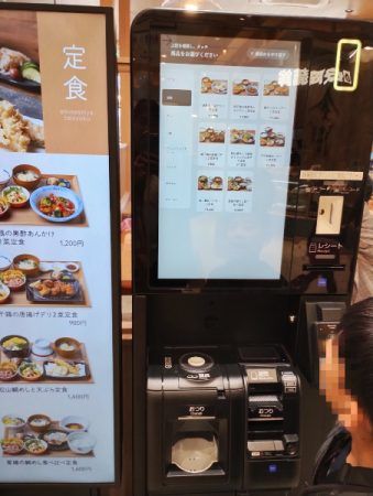 お店の前にメニューが表示される画面と、券売機があります。先に食券を購入するようです。