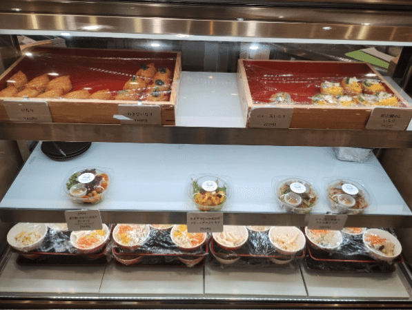 店内にあるショーケースにいなり寿司とデリのテイクアウト商品も用意されていました。 気になっていたいなり寿司を購入しました。ショーケースで注文して、ショーケース横のレジでお会計をしてもらえます。
