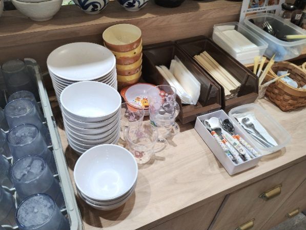 お冷やお手拭きなどはセルフサービスです。子ども用の食器も用意されていました。