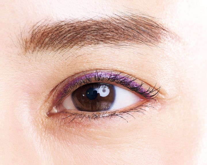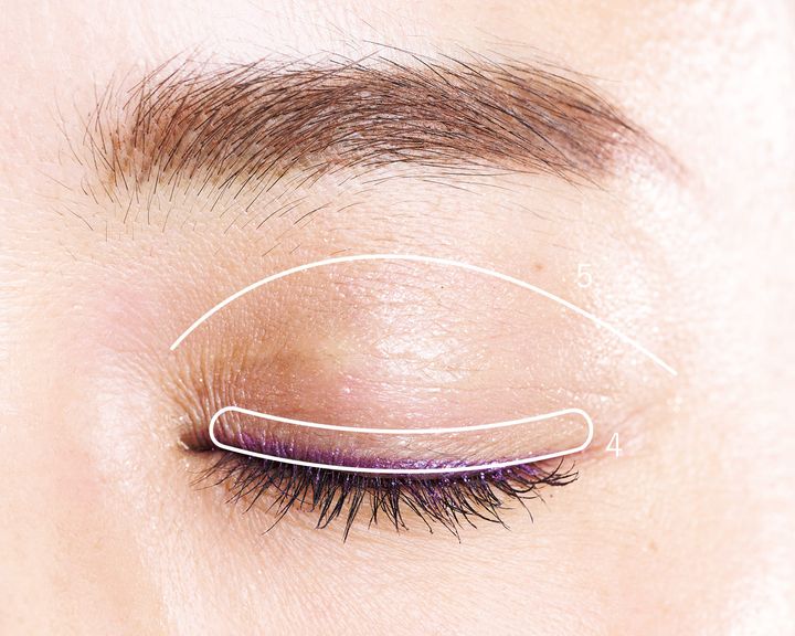 6のファンデーションを仕込んだあと、5をアイホールに薄く広げる。4で上まぶた目の際にラインを。インパクトのあるカラーラインは目尻からはみ出ないように目のフレームに沿って入れると、奇抜な印象にならない。