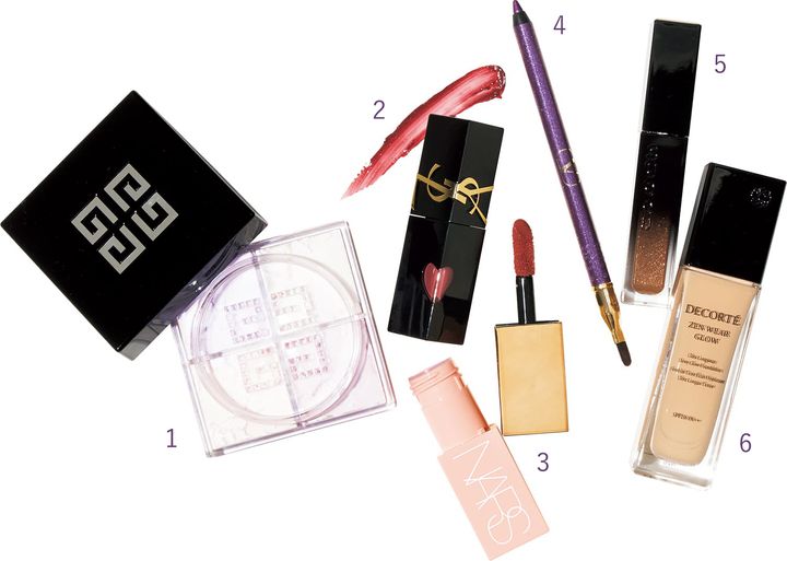 1:ポイントメイクまで終わったあとにふわっとのせてメイクをフィックスさせて。プリズム・リーブル 00 ¥8,250(パルファム ジバンシイ)2:鏡のように奥行きのあるツヤが魅力のリキッドリップ。YSL ザ インクス ヴィニルクリーム 622 ¥6,490 ※1/17発売(イヴ・ サンローラン・ボーテ)3:艶やかローズでツヤと血色をダブルでプラス。NARS アフターグロー リキッドブラッシュ 02801 ¥4,840(NARS JAPAN)4:存在感のあるグリッターパープルでクールに。ヴァレンティノ カラーグラフ 04 ¥6,380(ヴァレンティノ ビューティ)5:まぶたにフィットし、奥行きと煌めきを授ける。リクイド ラスター アイズ 04 ¥4,070(SUQQU)5:気になるアラを薄膜でカバー。艶めき肌が24時間持続。ゼン ウェア グロウ SPF20・PA++・UV耐水性★ 30ml ¥7,700(コスメデコルテ)