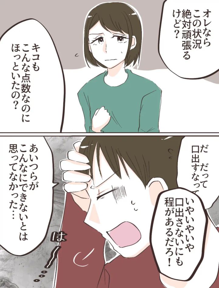 「オレならこの状況絶対頑張るけど?キコも、こんな点数なのにほっといたの?」と言い出すショウヘイに「だ、だって口出すなって・・」と口を開くと、「いやいやいや、口出さないにも程があるだろ!あいつらがこんなにできないとは思ってなかった・・」とため息をつきながら言いました。