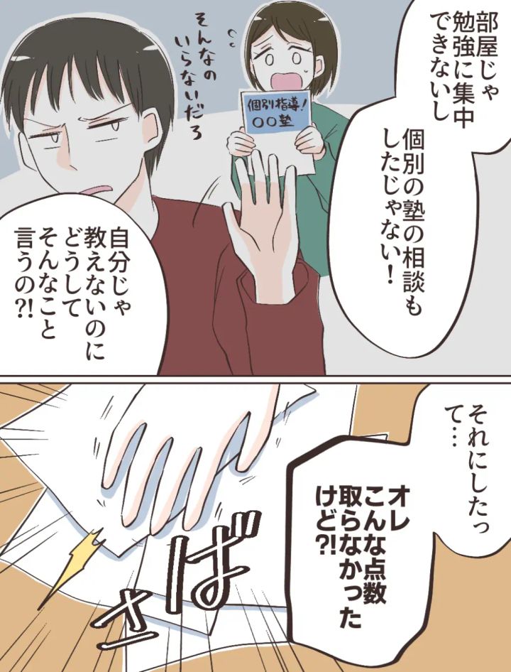 「部屋じゃ勉強に集中できないし、個別の塾の相談もしたじゃない!」キコさんがそう言い返すと、「そんなのいらないだろ」と即答するショウヘイに、「自分じゃ教えないのにどうしてそんなこと言うの!?」キコさんがそう言うと、「それにしたって・・オレこんな点数取らなかったけど!?」反論するショウヘイ。