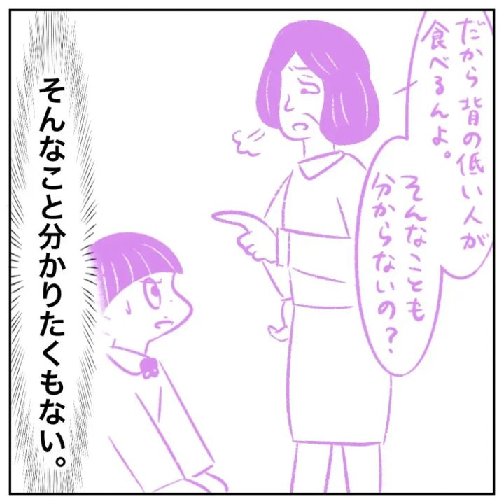 「だから背の低い人が食べるんよ。そんなこともわからないの?」と先生に言われ、「そんなことわかりたくもない」と愕然とするまるさん。