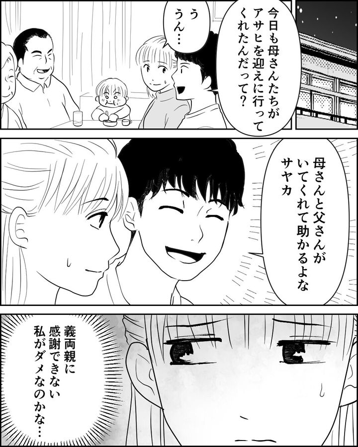 まずはサヤカの義父母、そして夫のカズマに対するコメントです。