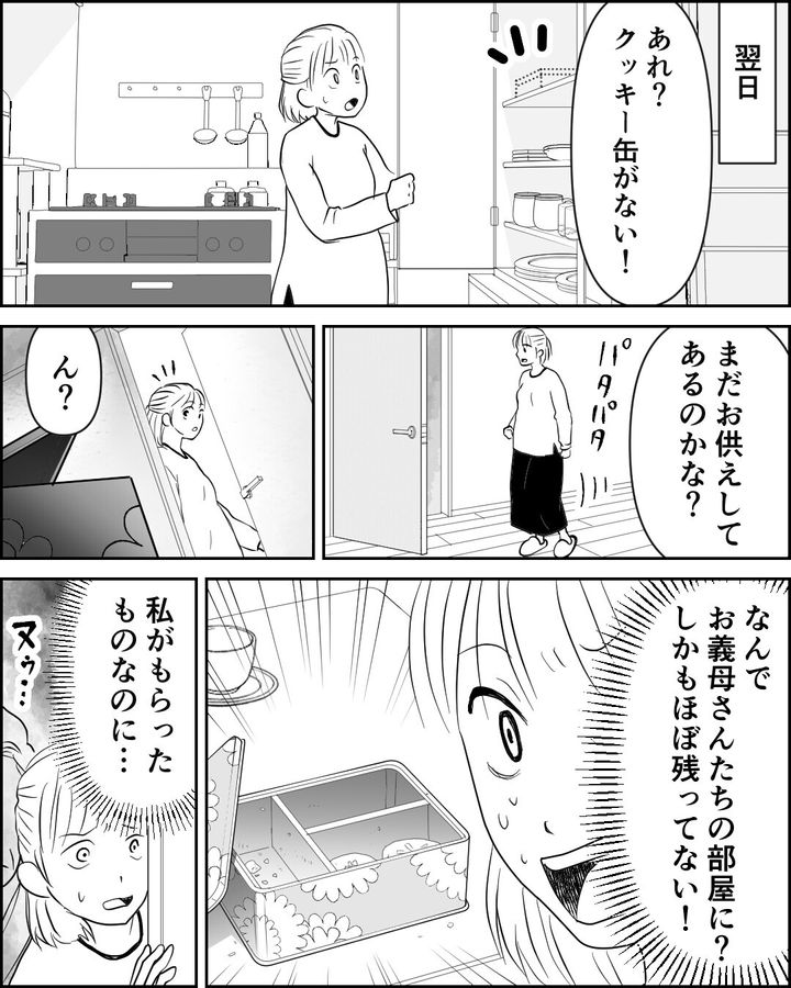 ・他人から頂いたものをまず仏前に供えるのはわかる。我が家でもやっている。だが、お嫁さんが頂いたものを勝手にひとりで食べるのは明らかにNG。食費の値上げ命令も含めて、完全に嫁いびりだと思う。
