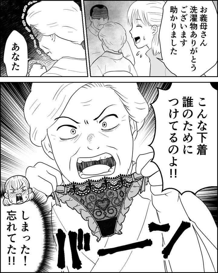 ・そうだよ、非常識を通り越して異常なんだよ、義父も義母も、コイツらの息子の夫も。嫁の下着を漁り、ちょっとセクシー路線の下着を見つけたからって、義父にまで見せびらかす義母は、どう考えても女性としては異常で異質だよ。下品で下劣でお育ちが知れますわ。