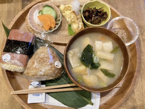 羽釜炊きのおにぎりが2個、具だくさんのお味噌汁に、鹿児島の郷土料理の豚みそ、さらに副菜が3品。 木のトレーがまたかわいい…!見た目も美しく、なんだか癒されます。