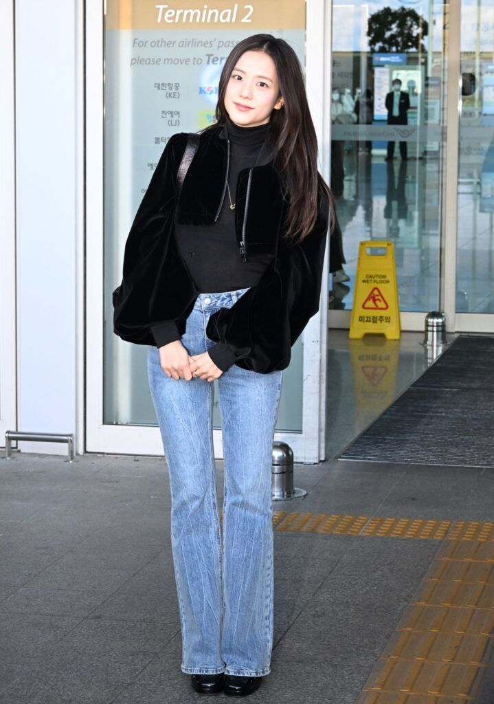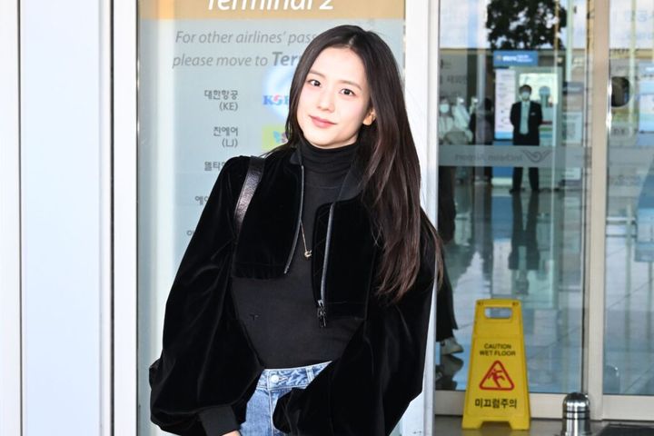 3. 【BLACKPINK ジス】クロップドジャケットの光沢感で洗練された雰囲気に!冬の空港ファッション