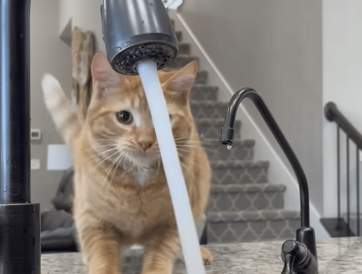 3. 興味津々だけどちょっと怖い? 蛇口のお水と戦う茶トラ猫さん