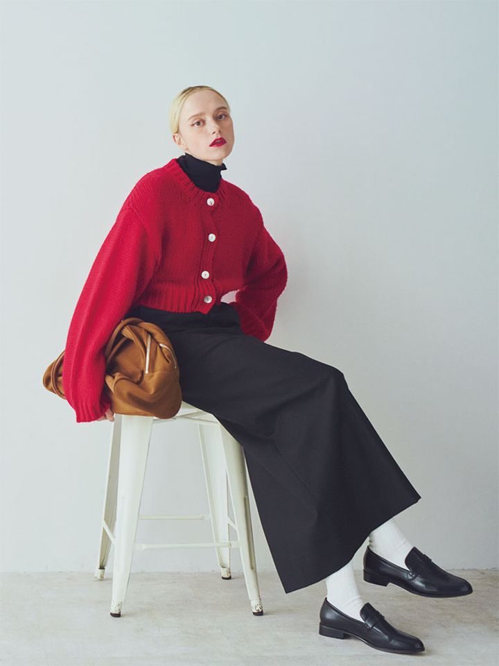 赤と一口に言っても、かもせる雰囲気はさまざま。きりっと緊張感のあるイメージだけでなく、愛らしい女っぽさにも振れる、使いやすい濃厚な赤のニットをご紹介。