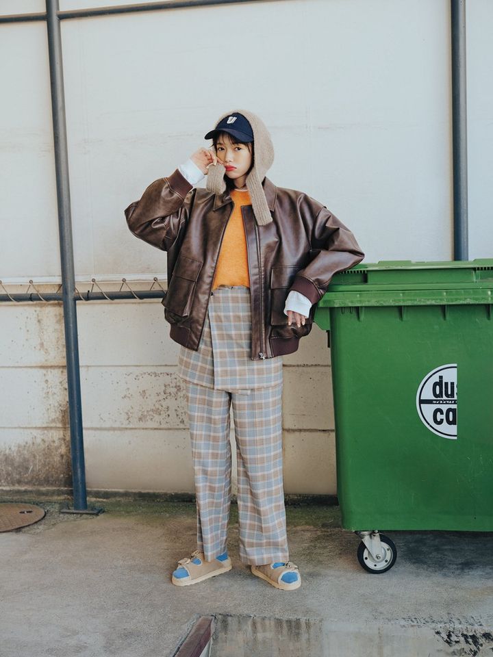 バラクラバとキャップ、あえてタイプの違う帽子を重ねづけするだけで一気に洒落見え!ブルゾンは、旬な古着っぽい深めブラウンフェイクレザーなら、重たさの中にもどこか軽やかさが出て良き。