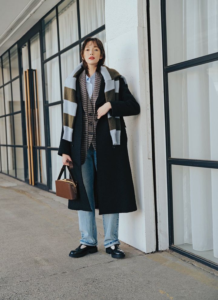ツイード風のクールなロングコートなら、Iラインも自然にアピールできてスタイルアップにも貢献してくれそう。オジなジャケット+ベストを浅い色のデニムで着崩しつつも、ウィングチップの正統派シューズで洗練されたトラッドを追求して。